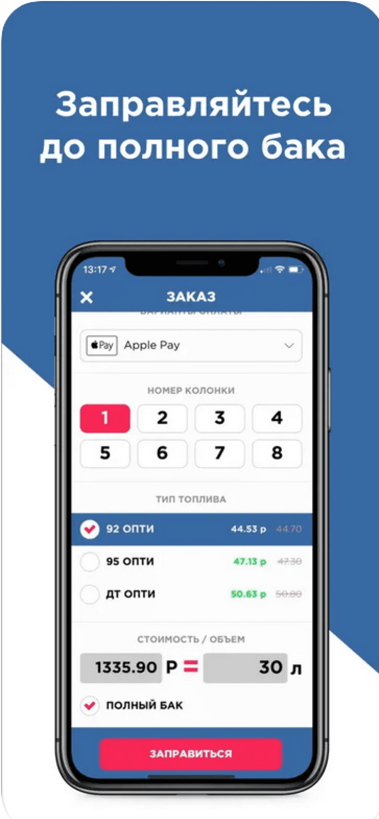 - возможность указать желаемый объём топлива в литрах или сумму в рублях;