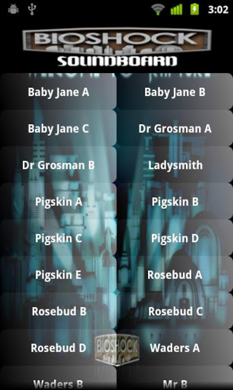 Bioshock Soundboard Набор звуков и фраз из всем известной игры Bioshock. Теперь вы с легкостью сможете не только использовать эти звуки в подходящих ситуациях, но и установить любую из них в качестве мелодии звонка или прочих уведомлений.