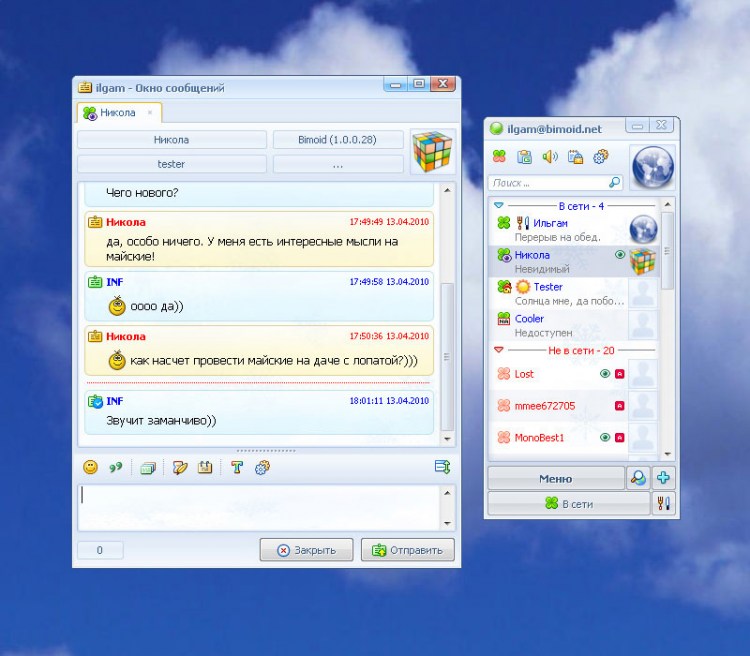 Bimoid messenger Простая и лёгкая клиентская программа для передачи сообщений через Bimoid сервер. Используя Bimoid мессенджер, вы можете подключаться к любому Bimoid серверу, установленному в вашей или любой другой сети, при наличии у вас соответствующего доступа и адреса сервера.