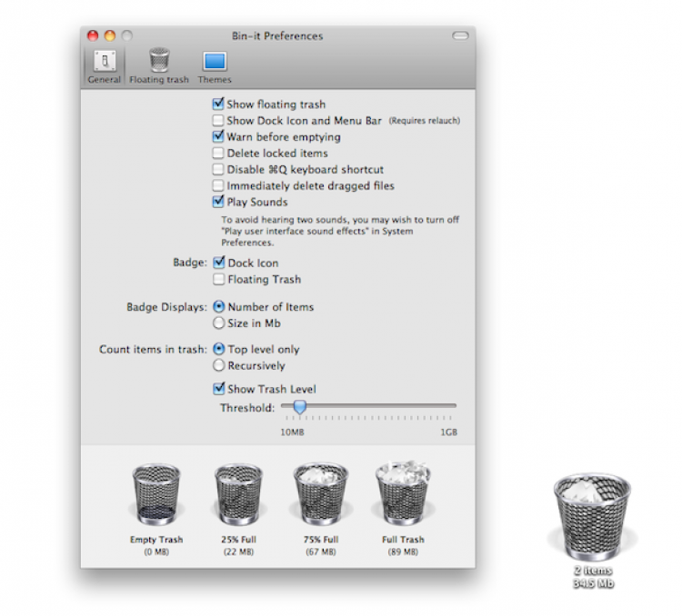 Bin-it Приложение, добавляющее настраиваемую корзину на рабочий стол вашего Mac, которая визуально наполняется в зависимости от объема помещенных в неё файлов. Приложение имеет несколько вариантов оформления и позволяет настроить прозрачность и прочие параметры ярлыка.