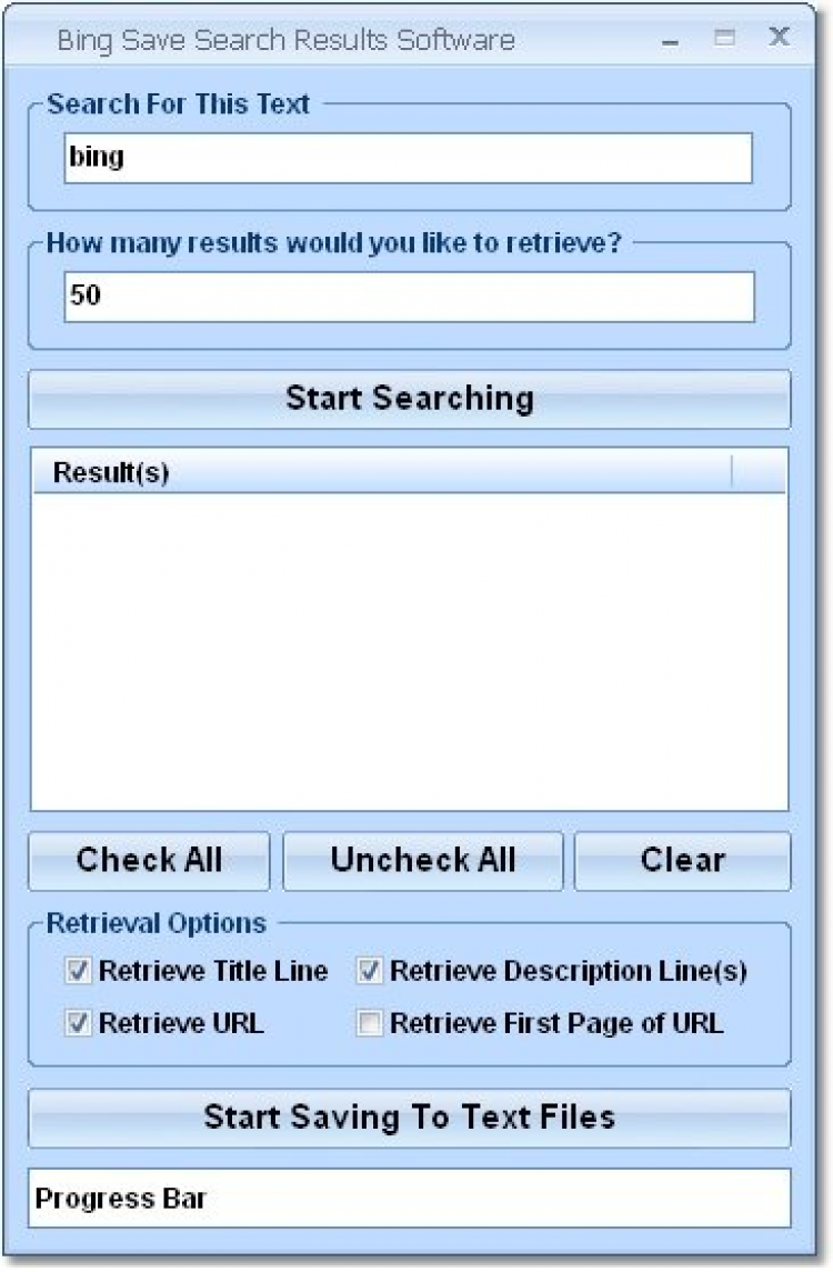 Bing Save Search Results - это утилита, с помощью которой можно сохранять результаты поисковых запросов, выполненных в Bing. Количество результатов поиска устанавливается вручную. Так же в окне программы можно отмечать те результаты, которые необходимо сохранить.