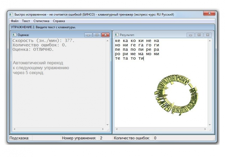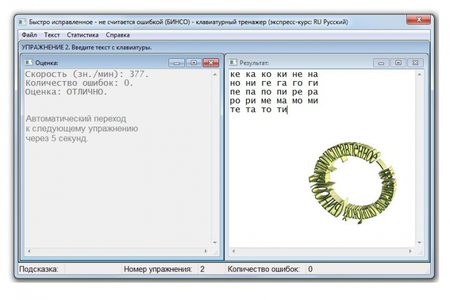 Можно исправлять неправильно набранный текст. И быстро исправленное - не считается ошибкой (в данном ПО). Не «садит» нервы, зрение и т. п. Всего 30 упражнений по 5 небольших строк. Подходит для любого возраста и разного уровня компьютерных знаний. Данный клавиатурный тренажер на основе слогов, слов и отрывков из стихотворений. Первые 10 упражнений - бесплатно. Доступны без регистрации.