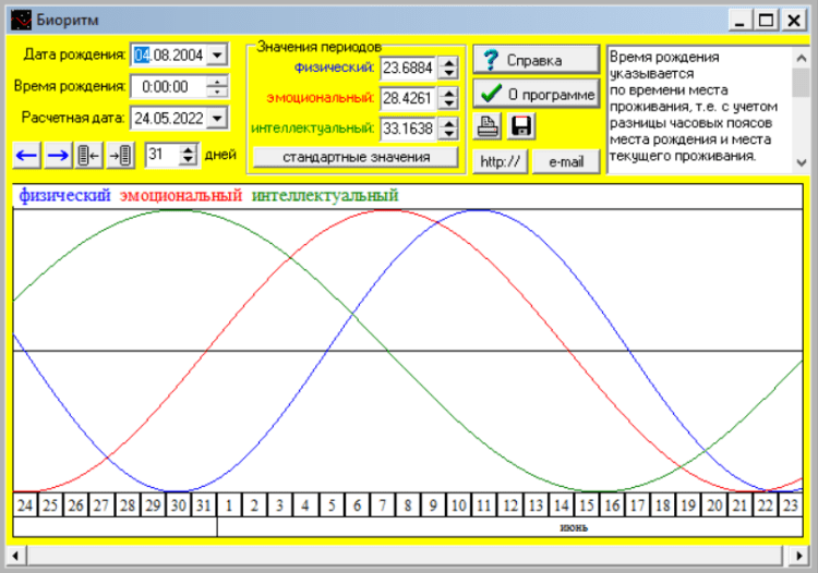 Биоритм - это программа для расчета биоритмов мозга. Строит графики физического, эмоционального и интеллектуального циклов, а также выводит на печать. Предназначена для определения опасных дней и может использоваться для планирования деятельности имеющей кукую либо степень риска.