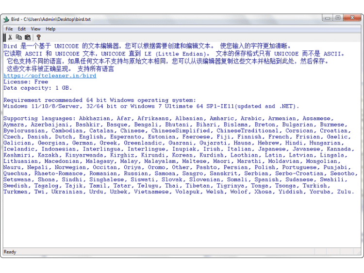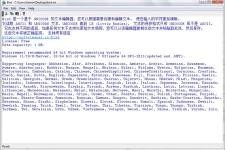 Bird - это текстовый редактор UNICODE с очень высокой четкостью текста, который вы можете видеть и писать. Если у вас есть проблемы со зрением, эта программа способна сделать текст более четким, чтобы его можно было легко увидеть. Она поддерживает различные языки и имеет объем памяти 1 Гб.