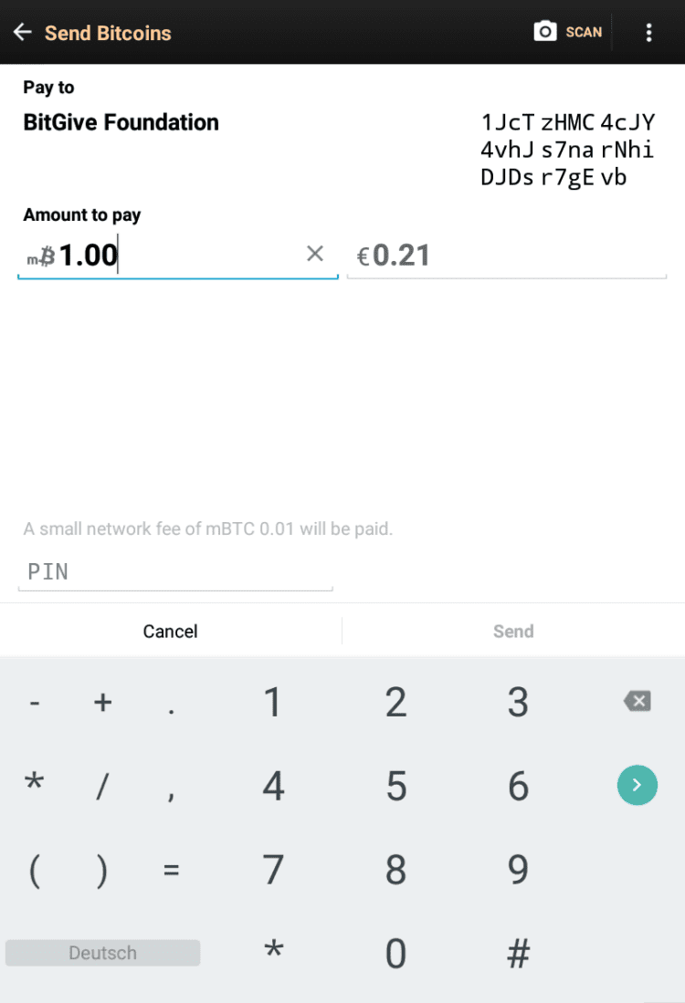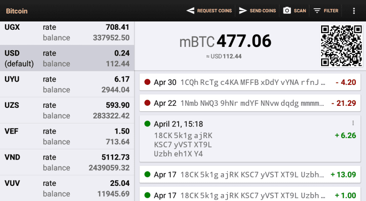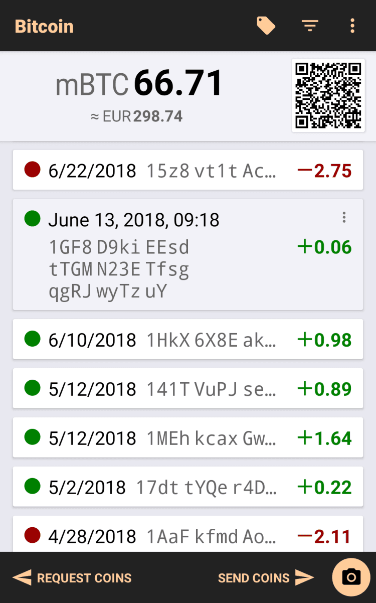 - отправка и получение биткоинов при помощи Bitcoin URL, путём сканирования QR-кода, либо через NFC или Bluetooth;