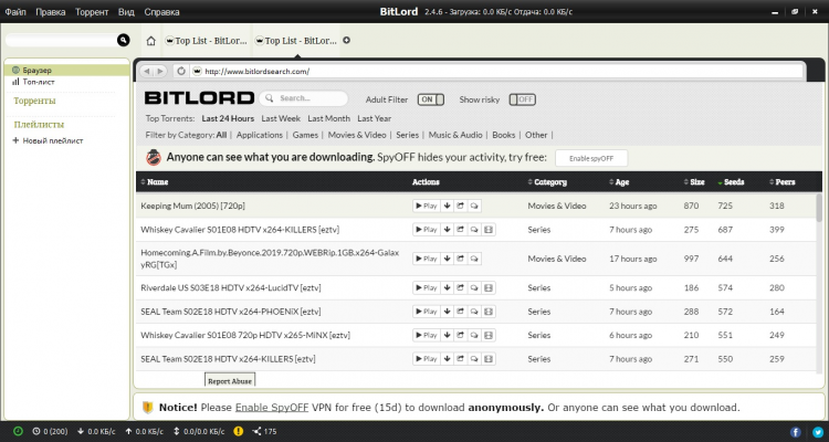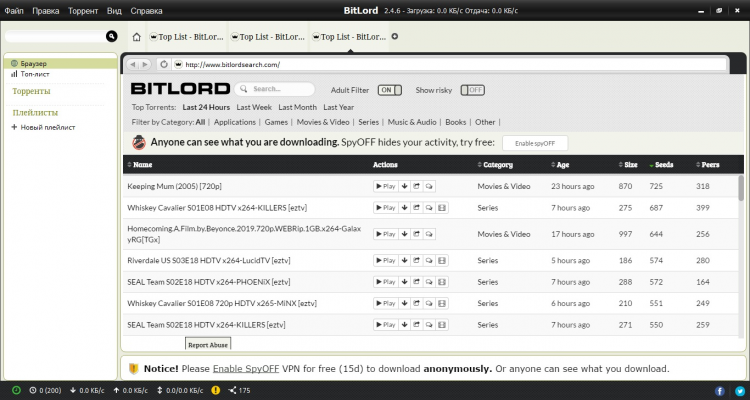 Перед вами удобный и функциональный торрент-клиент, который сделает скачивание любых нужных файлов значительно удобнее. Это станет возможным, благодаря наличию встроенного браузера с мощным поиском любых типов файлов. Обнаружив желаемый контент, вы можете приступить к его скачиванию. При этом, приятной особенностью BitLord станет возможность воспроизведения видеороликов во встроенном проигрывателе, прямо по мере их скачивания.