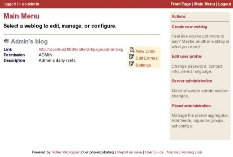 Roller поддерживает все функции, необходимые для создания площадки под персональные или корпоративные блоги. Он предоставляет возможность ведения групповых блогов, богатые возможности редактирования текста, настраиваемые шаблоны страниц, добавление комментариев, создание новостных лент.