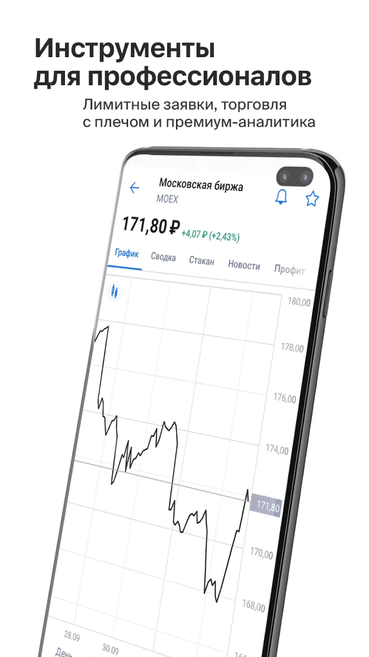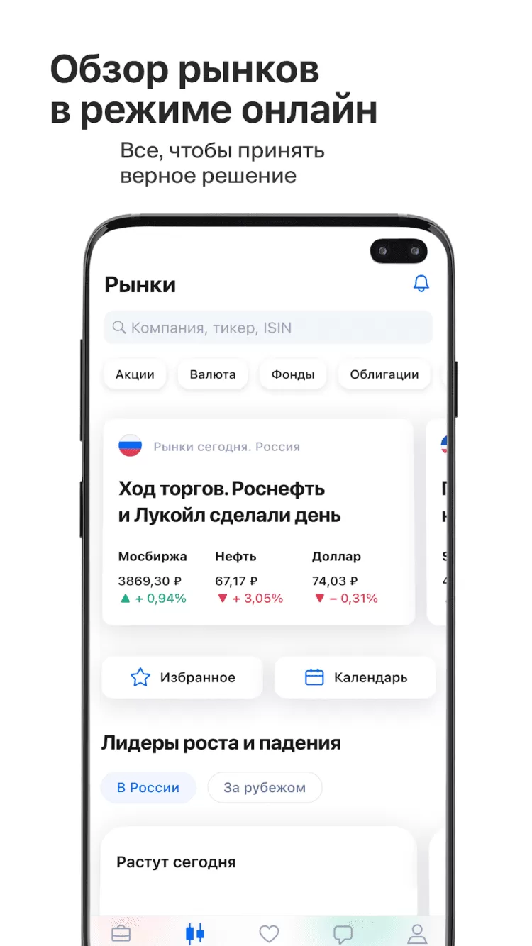 Это приложение предназначено как для опытных, так и для начинающих трейдеров. Здесь вы можете открыть брокерский счет или ИИС и получить доступ к MOEX, SPB Exchange и другим биржам в реальном времени. Регистрация займет всего несколько минут и потребует только наличи скана паспорта. Пополните свой счет с банковской карты и начните инвестировать в ценные бумаги, покупайте валюты и облигации, по биржевому курсу.