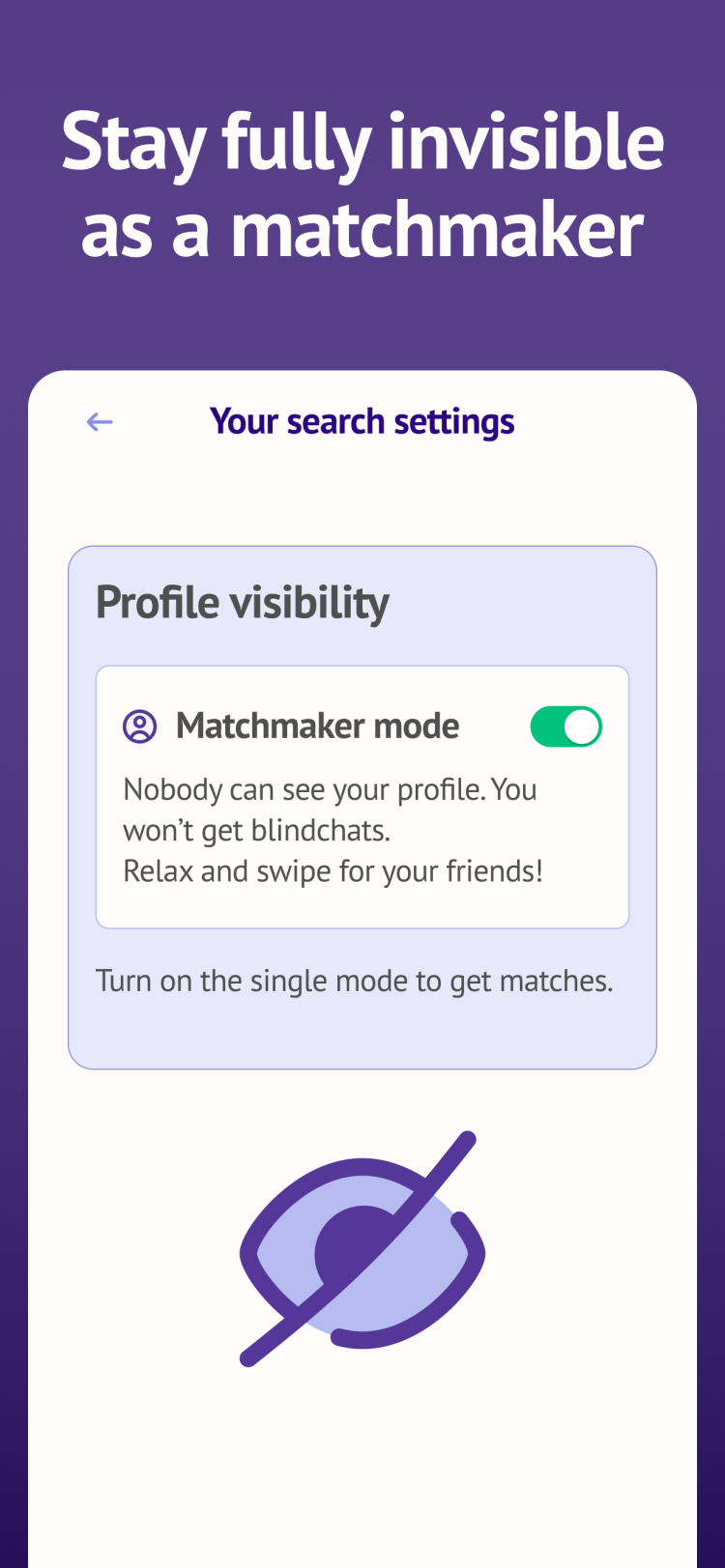 Последняя версия Blindmate для Android предлагает удобный чат, где одинокие люди могут знакомиться друг с другом, не раскрывая реальные номера телефонов. Специальные инструменты помогут вам начать общение легко и непринужденно, даже если вам обычно тяжело завязать разговор с незнакомцами. Ваш друг нашел вам подходящего партнера? Отлично, теперь вы можете отплатить ему тем же. Пользователи могут мгновенно переключать роли своих аккаунтов с одиночек на свах и наоборот, чтобы друзья всегда могли помочь друг другу найти лучшую пару.