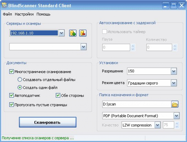 BlindScanner Standard позволяет удаленно сканировать и сохранять изображения в файлы. Сканирование в многостраничные файлы с использованием автоподатчика или по таймеру.