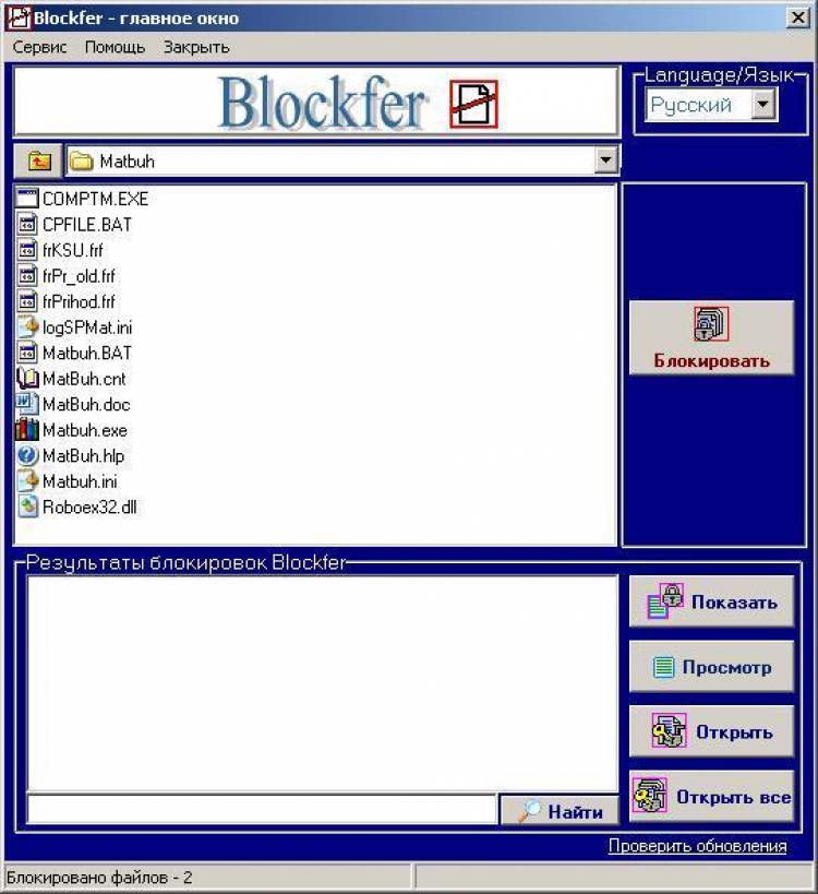 Блокировщик файлов - это программа предназначена для установки-снятия блокировки ко всем типам файлов. Действие программы обеспечивает блокировку любого доступа к выбранным файлам на чтение-запись, а также на операции с файлами: копирование, перемещение или удаление. Находящиеся под вашим контролем файлы защищены от несанкционированного доступа к ним других пользователей, а также от большого числа вирусных атак. Время действия блокировки: от запуска до выключения компьютера или до выгрузки программы. Тем самым можно обеспечить безопасное хранение личной информации и разрешать доступ к файлам по мере необходимости. Максимальное число блокируемых файлов - 1000.