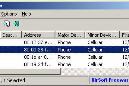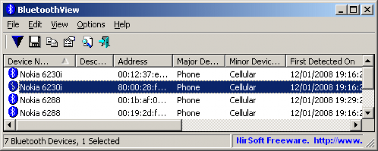 Утилита, которая работает в фоновом режиме и мониторит активность Bluetooth устройств вокруг вас. Для каждого найденного устройства отображается следующая информация: имя и тип устройства, адрес Bluetooth, время первого и последнего обнаружения, аутентификация и многое другое.