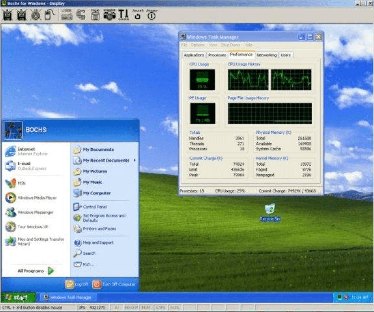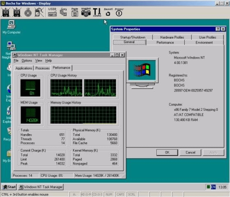 Bochs - это программное обеспечение для эмуляции аппаратного обеспечения IBM PC. Включает в себя эмуляцию процессоров архитектуры x86, устройств ввода-вывода и возможность использовать различные BIOS и видеоадаптеры. Может эмулировать 386, 486, Pentium, Pentium Pro, AMD64 и другие x86-совместимые процессоры, поддерживает MMX, SSE, SSE2, 3DNow!, SSE3, SSE4, x86-64, VMX, расширение системы команд AES.