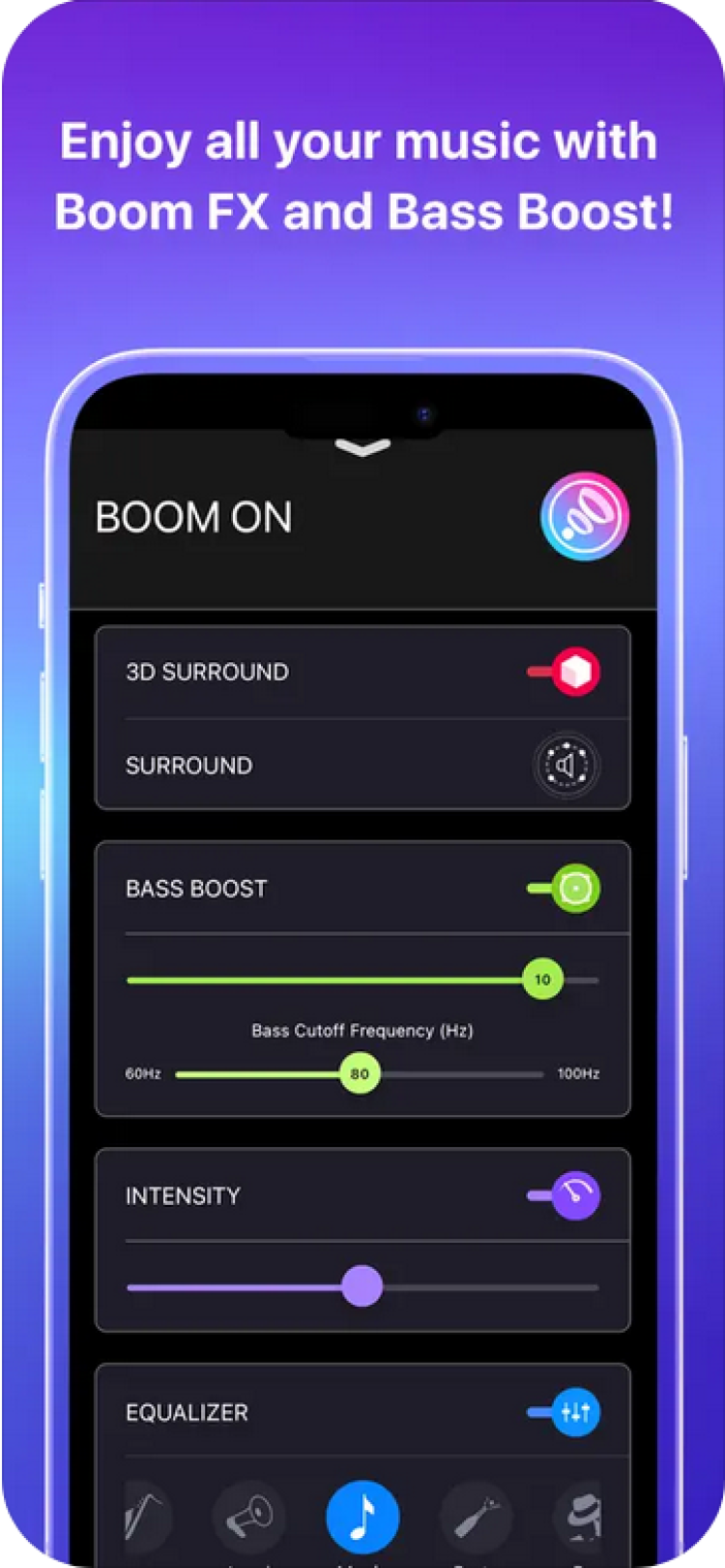 Boom: Bass Booster & Equalizer переопределяет способ прослушивания музыки, благодаря настраиваемому 16-полосному эквалайзеру. Он помогает точно настроить звук в соответствии с вашими предпочтениями. А мощный усилитель басов поможет оживить каждый бит и позволит вам ощутить всю мощь музыки, независимо от того, какой жанр вы предпочитаете.