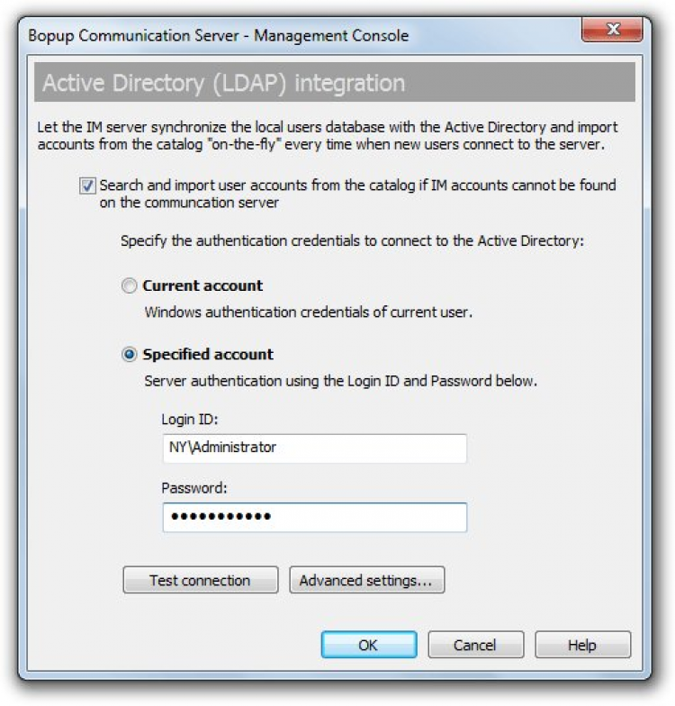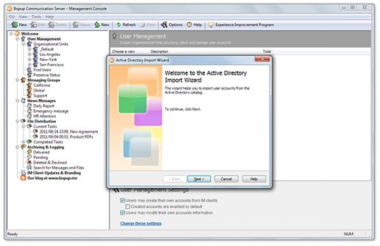 Имеется возможность импорта учетных записей пользователей из каталога Active Directory (LDAP), что невероятно облегчает развертывание полноценной системы обмена мгновенными сообщениями в инфраструктуре всего предприятия или компании.