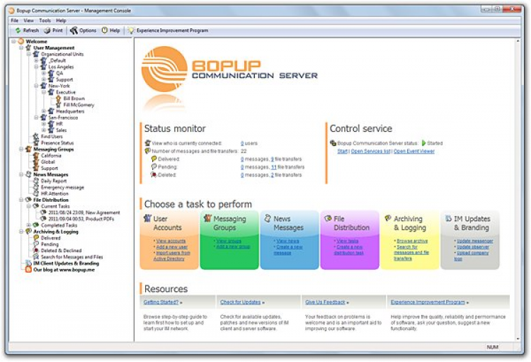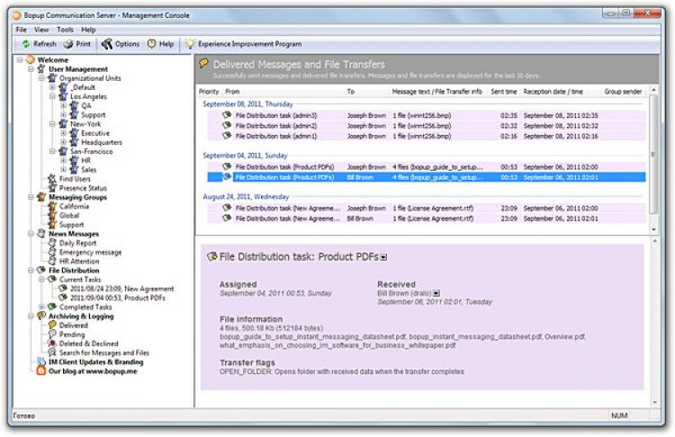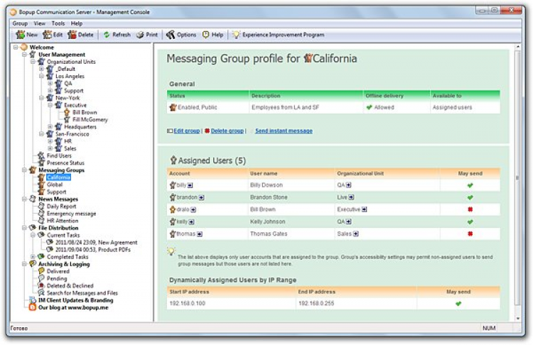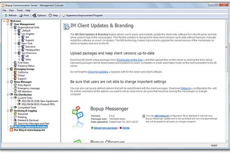 Централизованная клиент-сервер архитектура предоставляет мощные и гибкие средства для управления всей организованной системой обмена сообщений, с созданием пользовательских групп, распределением прав на отсылку групповых сообщений и видимость других пользователей для каждого из сотрудников.
