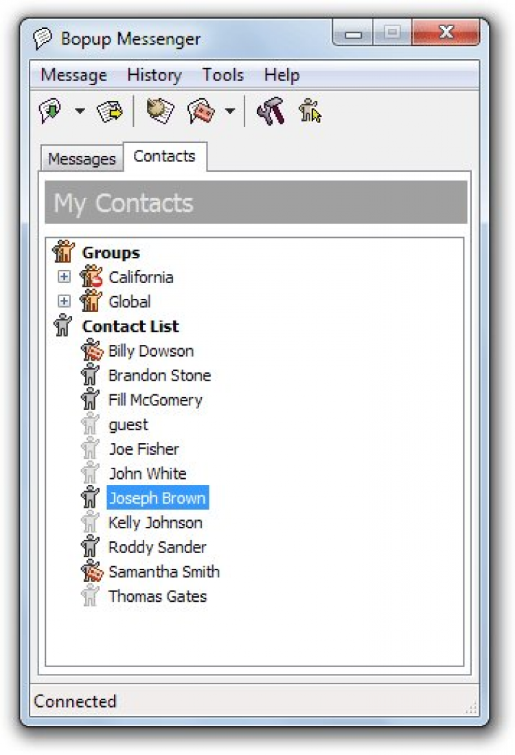 С его помощью вы можете легко объединить сотрудников из всех офисов и отделений организации в единую систему обмена сообщениями с возможностями отправки файлов, приоритетных сообщений с поддержкой гиперссылок, графических эмоций (пиктограммы, "смайлики") и форматирования текста сообщений, а также передавать важные документы с сервера конкректным пользователям.