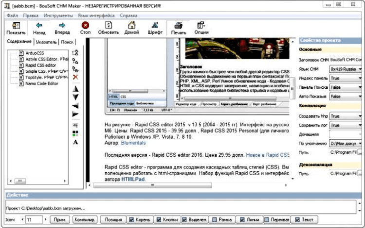 Кроме того, при помощи данной программы Вы можете декомпилировать имеющиеся у Вас CHM-файлы и получать из них исходные HTML-страницы. Эта функция будет полезна, например, при редактировании книги или поиске требуемой информации. Если у Вас имеется папка с готовыми html-страницами, то с помощью программы BouSoft CHM Maker Вы сможете добавить все страницы из этой папки в проект одним кликом мыши. Если же страницы будущей книги находятся в разных папках, то Вы можете добавить их по отдельности.