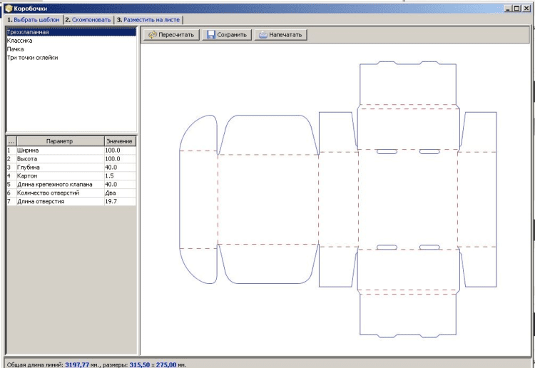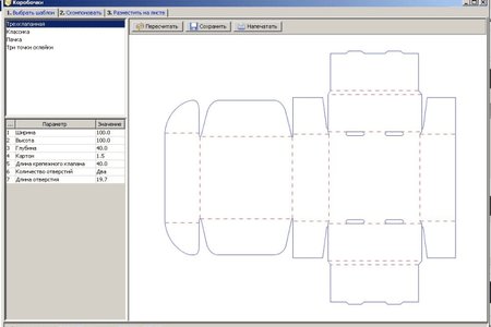 Работа с программой не вызывает затруднений, нужно всего лишь выбрать тип коробки, ввести габаритные размеры будущей упаковки, толщину картона, а так же другие параметры, свои для каждого вида коробок.
