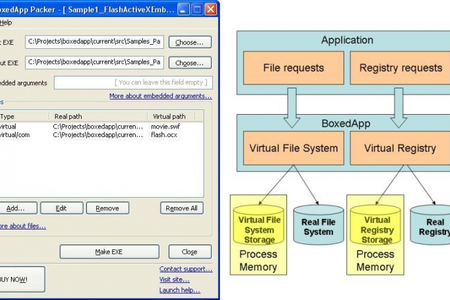 BoxedApp Packer - это решение, которое упаковывает все зависимости в один единственный файл, который при запуске создает виртуальную файловую систему (в нее распаковываются внедренные файлы) и виртульный реестр (туда, к примеру, попадают дополнительные записи для корректной работы внедренных ActiveX-элементов). При этом упакованный файл не будет создавать временных файлов или модифицировать реестр. Все происходит в памяти. Вот почему не страшны ни нехватка прав на запись в реестр, ни нехватка прав на запись на диск.