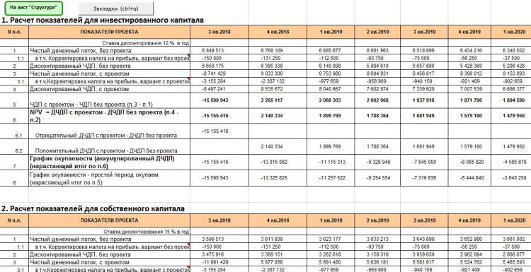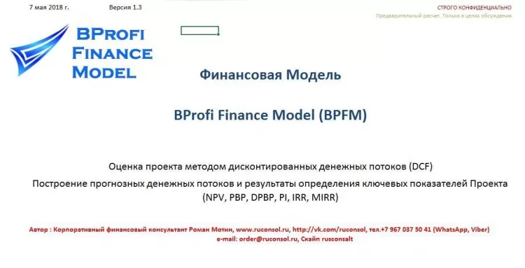 Excel BProfi Finance Model - финансовая модель с профессиональными возможностями, предназначена для разработки и оценки инвестиционных проектов, а также для подготовки бизнес планов, ТЭО, меморандумов, планов финансово-хозяйственной деятельности и инвестиционных программ, оценки эффективности проектов государственно-частного партнерства, а также прогноза текущей деятельности для среднего и крупного бизнеса.