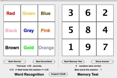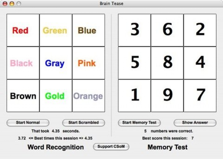 Brain Tease Программа создана для того, чтобы помочь пользователю познать феномен процесса восприятия во время чтения, а так же потренировать внимательность, кратковременную память и концентрацию. Для тренировки восприятия создано левое поле, с цветами, а для памяти - правое, с цифрами.