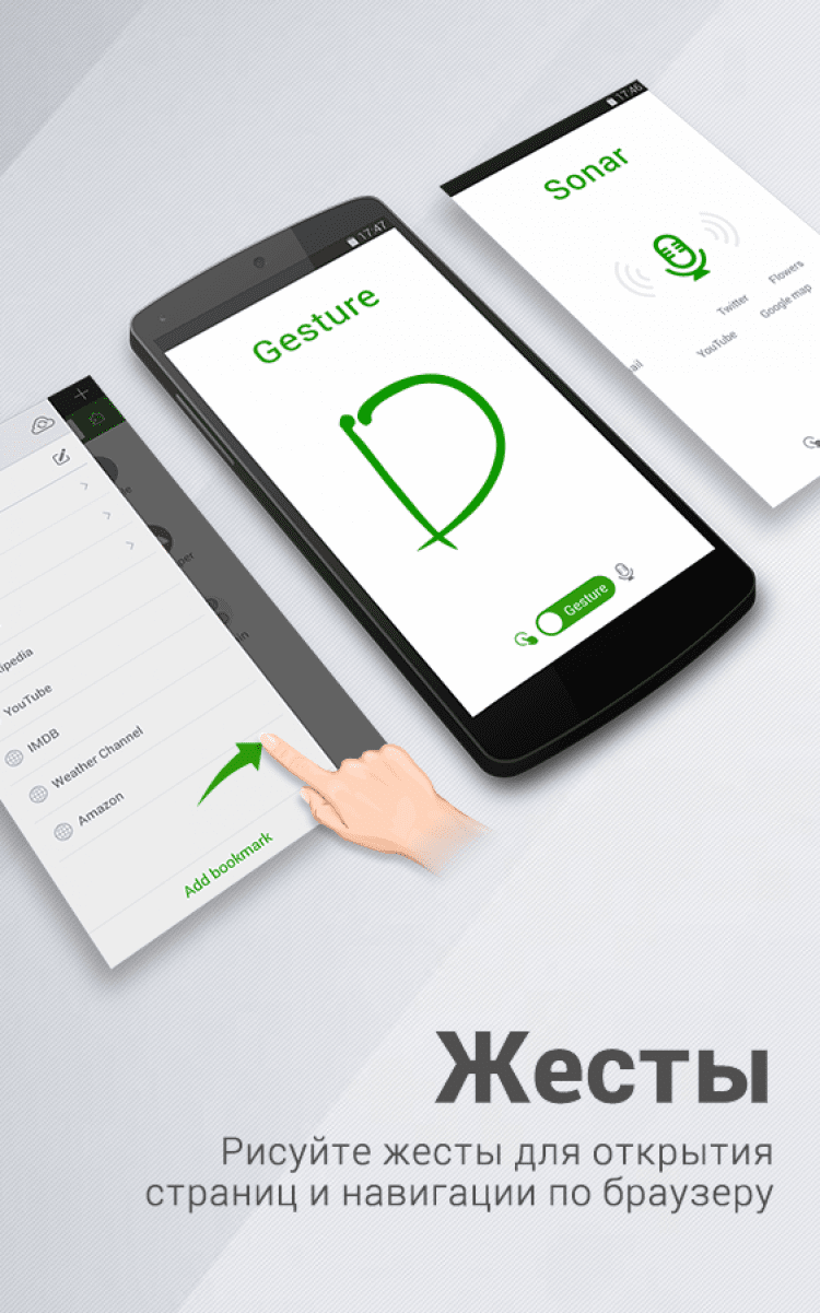 Благодаря функции Sonar, Dolphin Browser позволяет управлять поиском и вкладками при помощи голоса. Встряхните свое устройство и приложение активирует инструмент распознавания голоса. Продиктуйте поисковой запрос или просто скажите браузеру, что вы хотите чтобы он сделал.