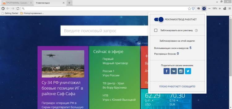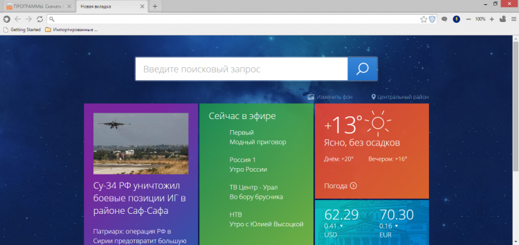 Браузер Спутник имеет вполне привычный интерфейс в котором не сложно разобраться. На новой вкладке он показывает плитки в стиле Windows 8 с информацией о погоде, новостях, курсе валют и ТВ программой. Также есть несколько плиток которые ведут на различные полезные порталы, например, сайт госуслуг, фирменные карты Спутника со справочником организаций и пр.