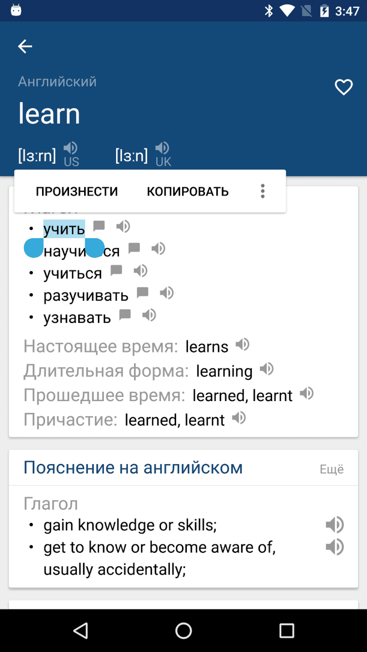 - прослушивание произношения слова, благодаря технологии Text-To-Speech, разработанной iSpeech;