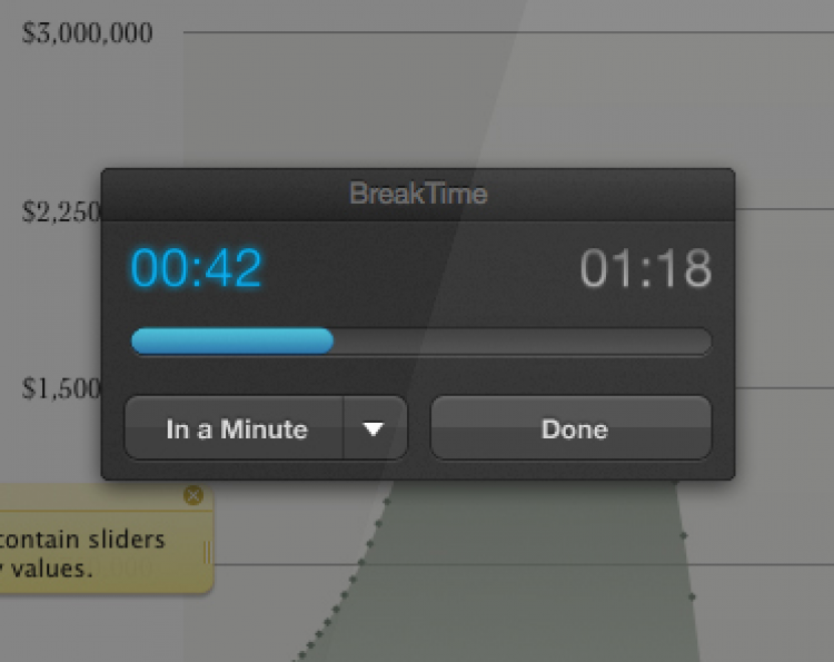 BreakTime Напомнит, когда нужно отвлечься от работы и сделать короткий перерыв.