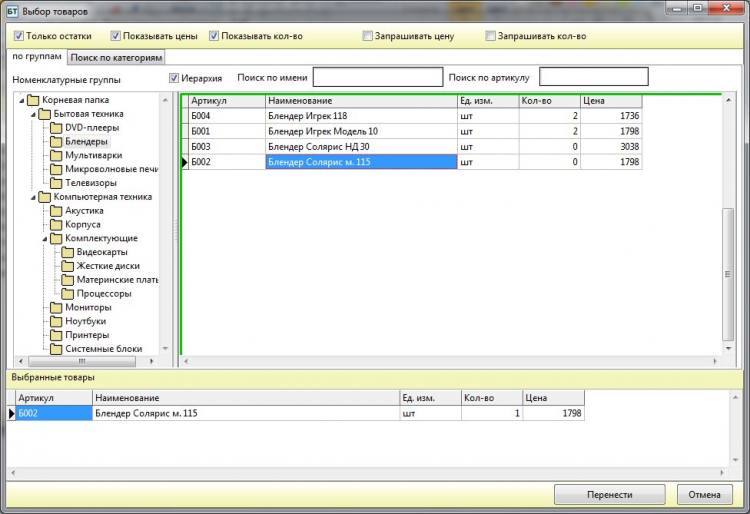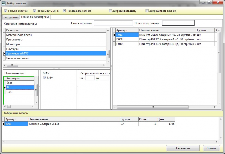 - 2 режима подбора товаров – "классический", по справочнику номенклатуры, и по характеристикам категорий (нечто подобное можно видеть в интернет-магазинах);