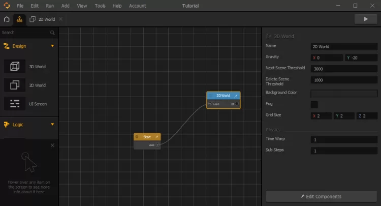 Процесс создания игры тут построен на манипуляции с логическими блоками, между которыми выстраиваются определенные связи, и которые представляют собой структуру игры. Каждому игровому элементу (объекту, персонажу и пр.) соответствует свой блок. Для определения свойств, например, персонажа к его блоку подключается другой блок с характеристиками вроде движения, физики и пр. Добавляя таким образом блоки, устанавливая связи между ними, и настраивая их свойства, и происходит создание игры. Это довольно простой для освоения способ, который предлагает вместе с тем широки возможности и креативную свободу.