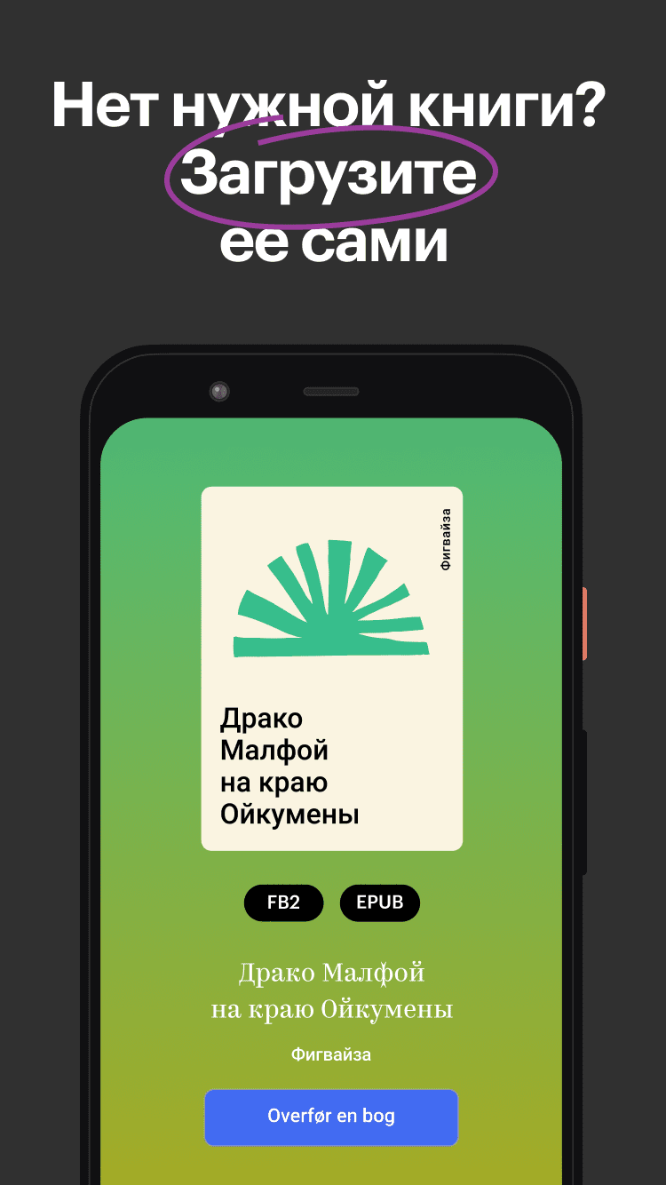 - возможность бесплатной загрузки собственных книг в форматах EPUB и FB2, которые в дальнейшем будут доступны без доступа в Интернет.