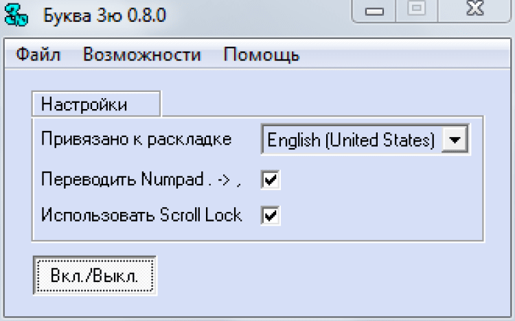 Буква Зю - эта программка переводит транслитерацию латинских букв и их комбинаций в русские буквы. Несколько заметок о работе с "Буквой Зю": а) Программа изначально активна, её можно активировать/дезактивировать нажатием кнопки Вкл./Выкл. или клавиши Scroll Lock б) Можно выбирать к какой раскладке привязана программа (для людей у которых по тем или иным причинам нет возможности установить русскую раскладку) в) Чтобы начать печатать в транслитерации просто запустите программу, переключитесь на на раскладку которую вы выбрали в списке ”Active On” Layout с помощью Alt+Shift или как там вы привыкли это делать. г) все клавиши кроме букв аналогичны английской раскладке кроме ” и ~ , так как они используются как Ь и Ъ соответственно чтобы всё-таки добраться до английских знаков на этих клавишах придерживайте клавишу Контрол. д) Есть возможность определять будет ли трансформироваться точка из Numpad в запятую или нет