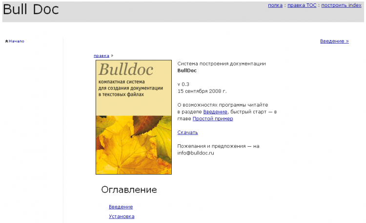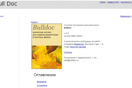 BullDoc Bulldoc — это программа для построения документации на основе текстовых файлов, которые можно хранить в svn. Документацию можно собрать как в виде статического набора html файлов с классической навигацией в виде меню, ссылок взад-вперед, так и подготовить файлы проекта для сборки в chm с помощью Microsoft CHM SDK.