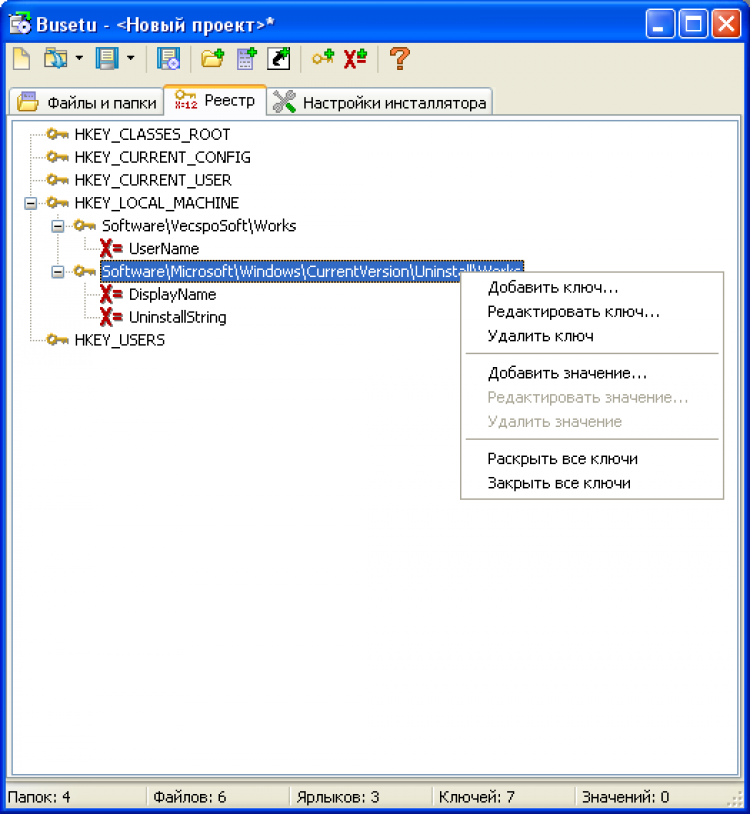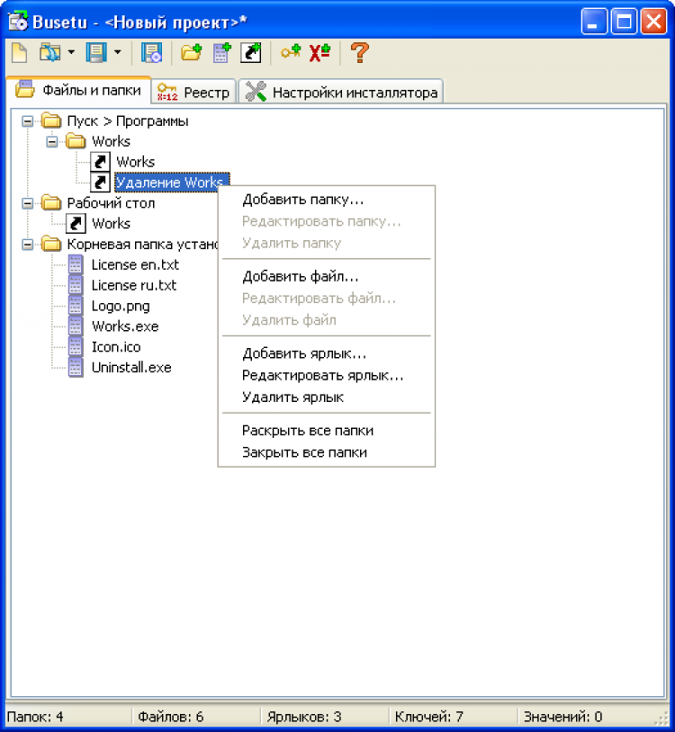 BuSetu - это программа для создания инсталляторов (программ-установщиков). Инсталлятор может создавать папки, файлы, ярлыки, записи в реестре. Используя BuSetu Вы сможете легко создавать программы-установщики, которые установят любую Вашу программу (или что-то другое) на компьютер пользователя. Создание инсталлятора происходит в три этапа: добавление папок, файлов и ярлыков, создание записей в реестре, настройка инсталлятора. Получаемый в итоге инсталлятор состоит из одного исполняемого файла, Вам не придется поставлять с ним никаких дополнительных файлов или библиотек.