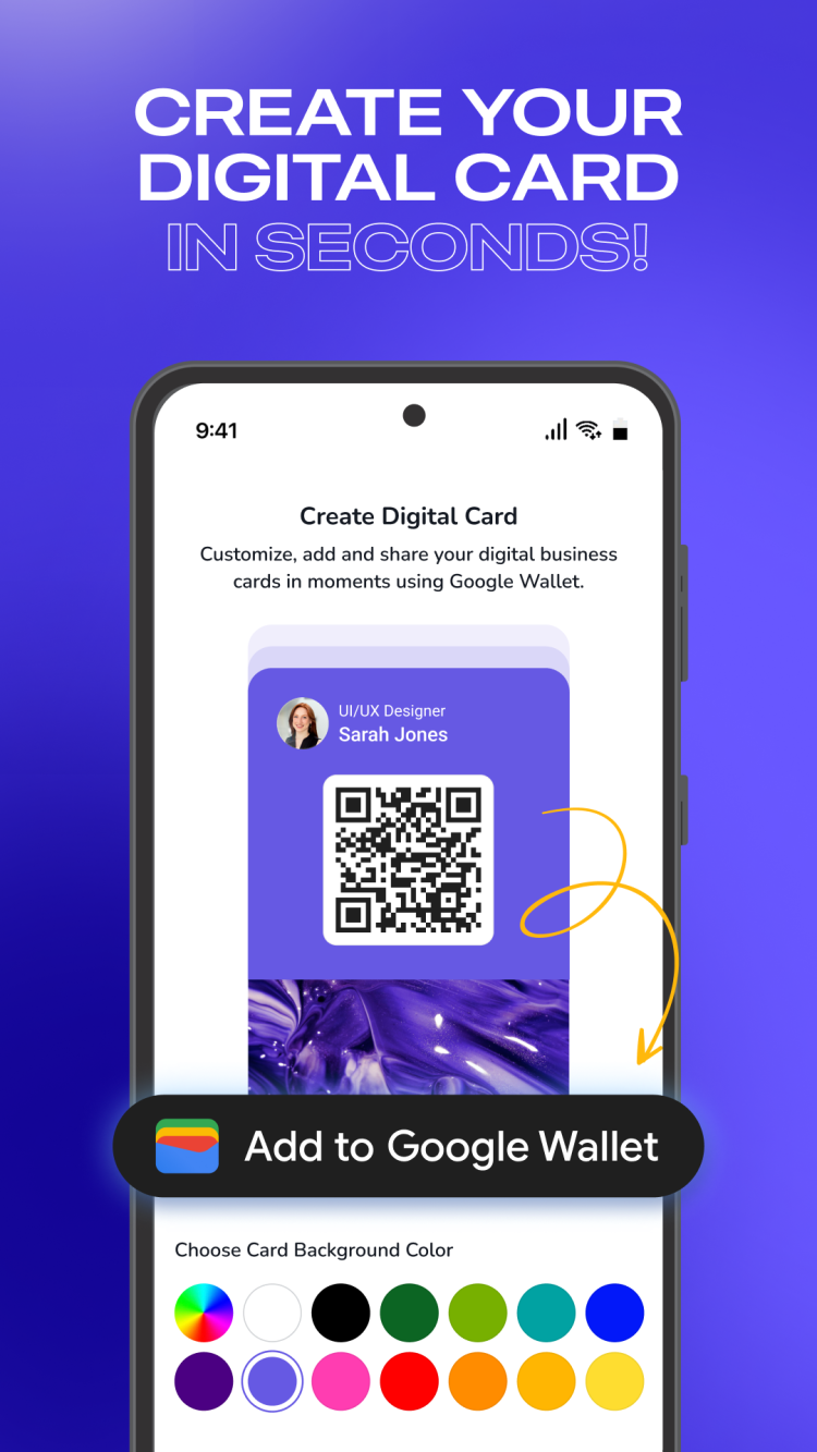 С Business Card Maker создание профессиональных цифровых визиток не займет у вас много времени. Вам даже не понадобятся какие-либо навыки или опыт в дизайне или редактировании изображений. Все, что вам нужно сделать, это настроить дизайн виртуальной визитки, затем ввести свое имя и контактную информацию. После этого вы можете сохранить свое творение в Google Wallet.