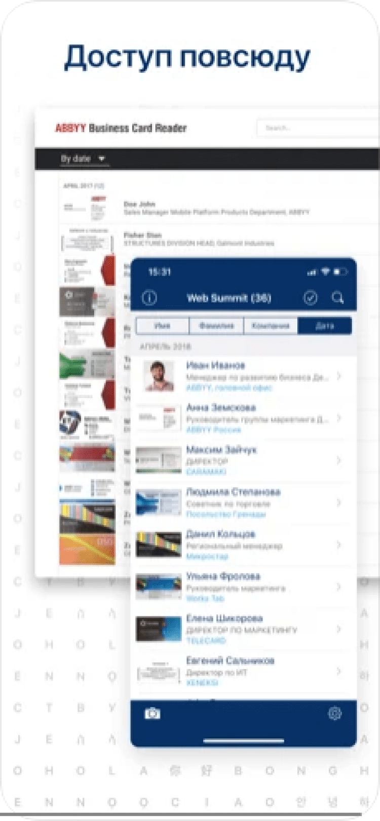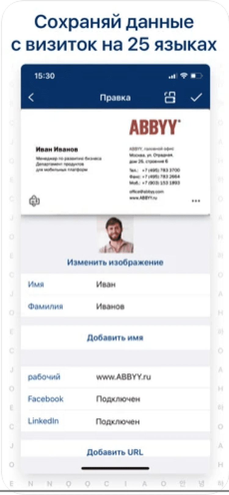 Business Card Reader - это многофункциональная программа для работы с вашим списком контактов. Она позволяет сканировать данные с визитных карт ваших клиентов, партнеров или коллег на 21 языке, просто сфотографировав ее. Контактные данные, отсканированные приложением, будут доступны в любой момент со всех ваших Android и iOS устройств, благодаря автоматической синхронизации данных. Так же, всеми контактными данными можно быстро поделиться по SMS, e-mail или Wi-Fi.