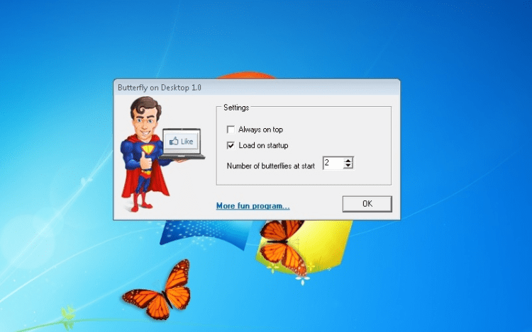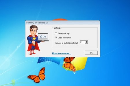 Butterfly On Desktop - это самые реалистичные бабочки для рабочего стола! Полностью имитируют поведение настоящей бабочки. Через иконку в трее можете настроить программу, задать количество бабочек появляющихся при старте компьютера либо установить бабочек по вверх всех окон.