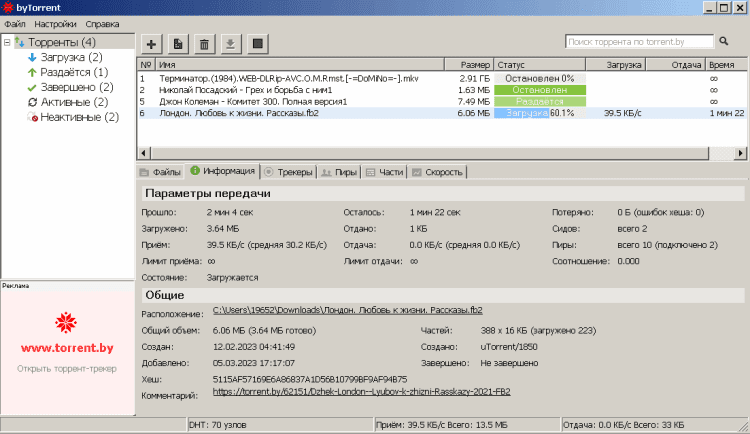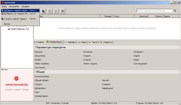 Основные возможности byTorrent: