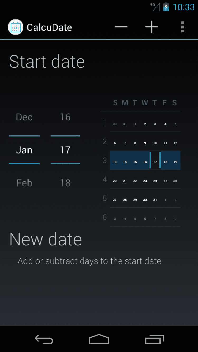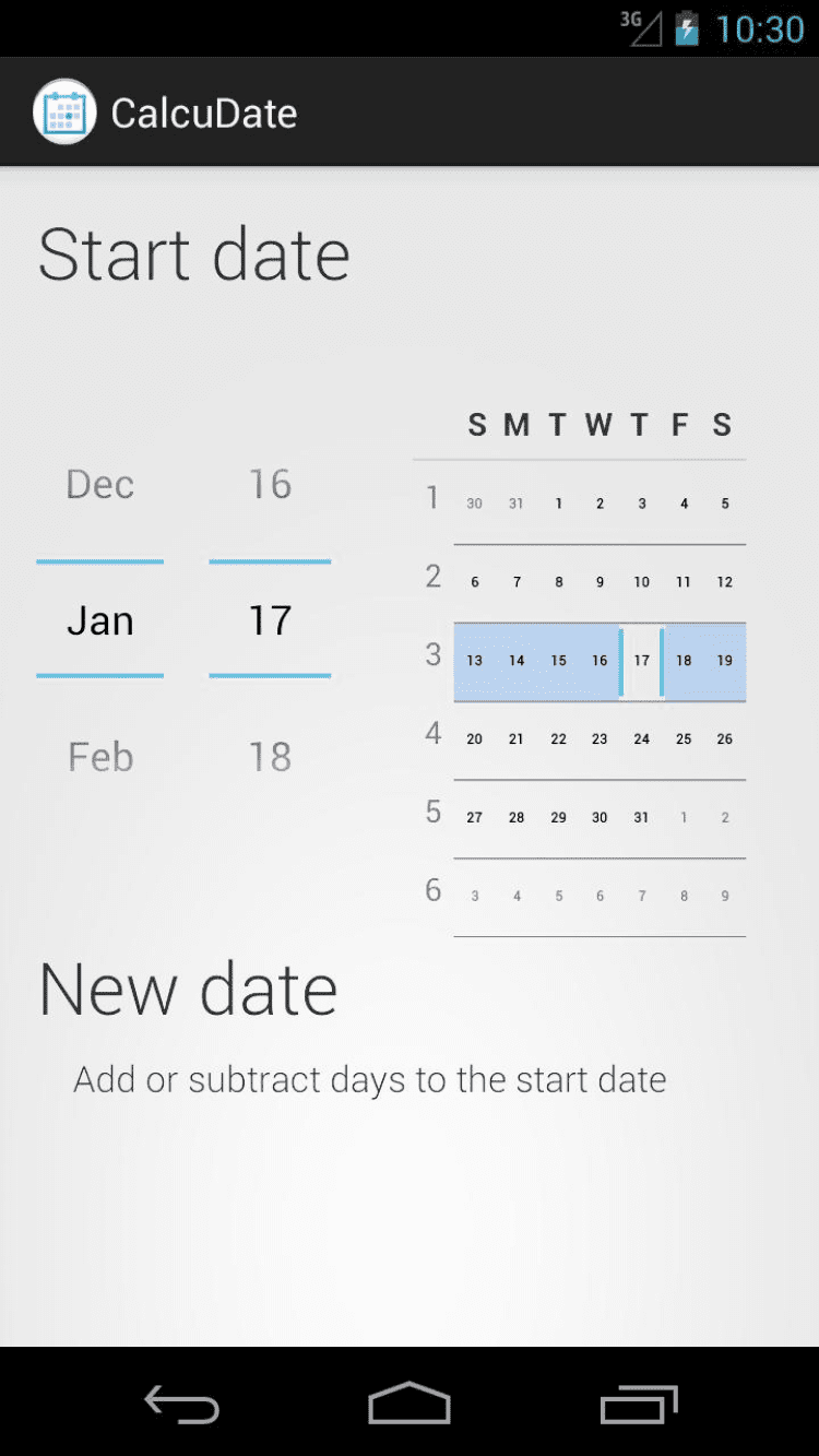 CalcuDate Удобный калькулятор дат календаря для мобильных устройств на Android. С помощью этой программы вы сможете быстро добавить или вычесть дни из любой календарной даты, а так же рассчитать новую дату.