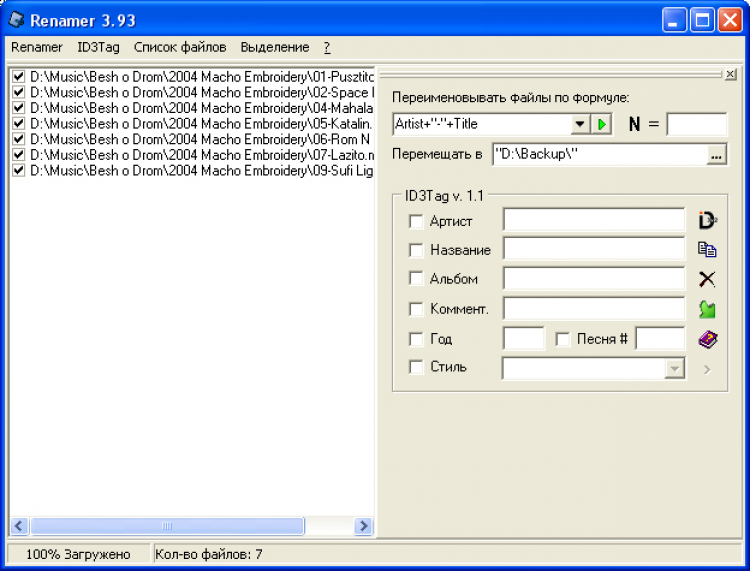 Программа для переименования файлов по определённой формуле (шаблону). Программа может также использовать все параметры ID3Tag v. 1.1, ID3Tag v. 2.0 для mp3-файлов, возможность создания m3u, pls, html - листов. Вы можете по определённой формуле задать каталог для новых файлов используя ID3Tag v. 1.1, ID3Tag v. 2.0. Существует возможность копирования данных из ID3Tag v. 1.1 в ID3Tag v. 2.0 и наоборот. Есть подробная справка, опции для более удобной работы с программой, а также множество других функций.