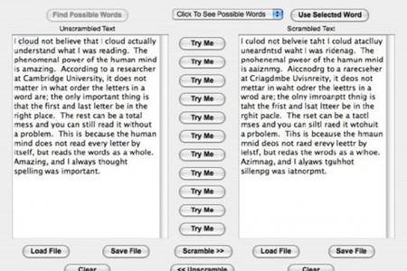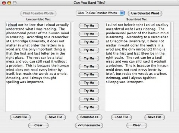 Can You Raed Tihs? Программа, наглядно демонстрирующая удивительную возможность нашего мозга читать текст по первой и последней букве каждого слова, даже если все остальные буквы перепутаны местами. Выглядит это примерно так: в левой части окна находится текст, после нажатия на кнопку "scramble" он перемещается в правую сторону уже в измененном варианте, где первая и последняя буквы каждого слова находятся на месте, а все остальные перепутаны.
