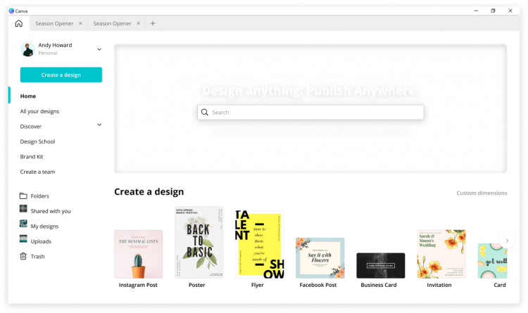 Canva - это интуитивный кроссплатформенный редактор графического дизайна и видео для создания презентаций, открыток, картинок для социальных сетей и коротких роликов и анимации. Canva работает по принципу конструктора, в котором новое изображение можно получить на основе редактируемых шаблонов или собрав из отдельных элементов. Для работы в программе требуется бесплатная регистрация.