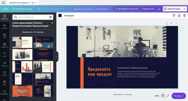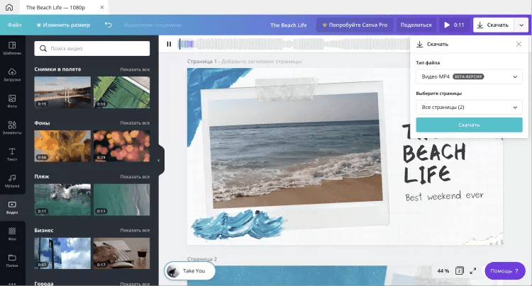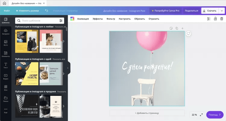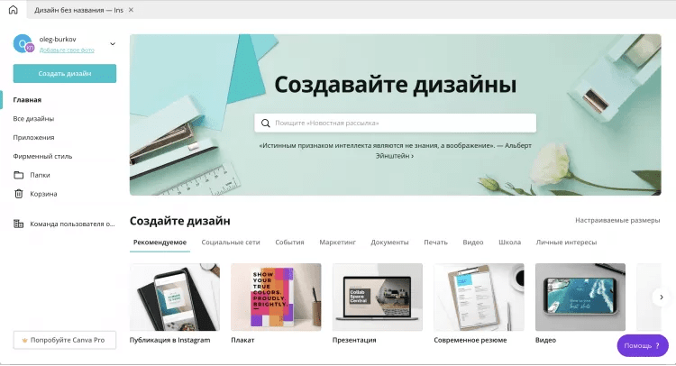 Canva предлагает десятки тысяч шаблонов плакатов, брошюр, визитных карточек, логотипов, презентаций, рекламных баннеров и т.д. В оформлении можно использовать собственные материалы, загруженные с компьютера или из подключенных к профилю облачных файлохранилищ. Готовые дизайны можно сохранять в форматах JPG, PNG, PDF, GIF и MP4 для видео.