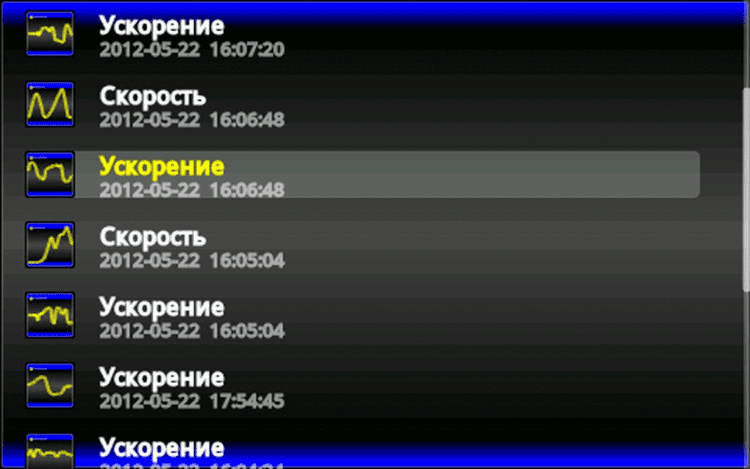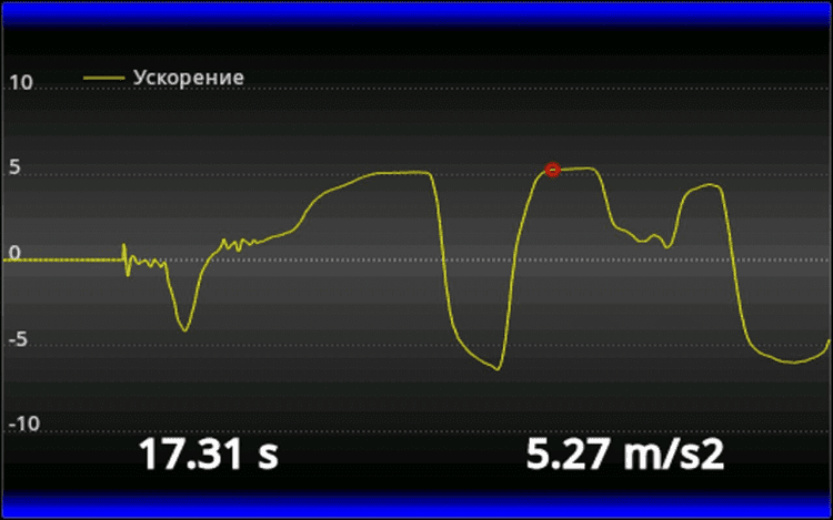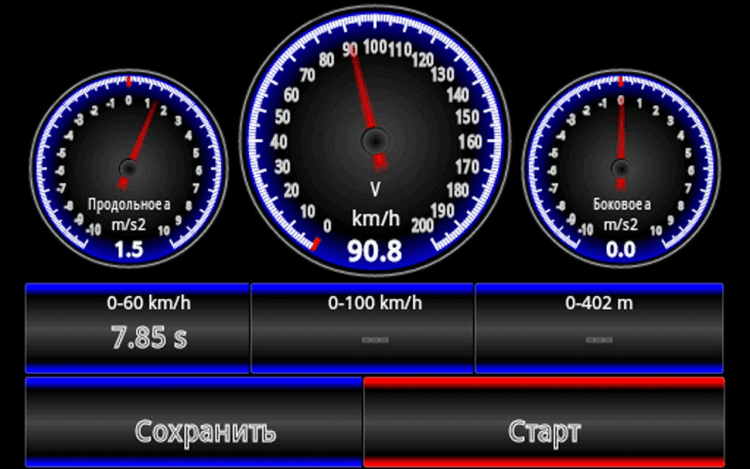 На приборной панели Вы можете видеть ваше ускорение и набранную вами скорость. Спидометр имеет звуковую индикацию, при наборе каждого десятка скорости происходит подача звукового сигнала. Полученный результат можно сохранить и просмотреть в виде графика. Передвигаясь по графику Вы увидите точные значения в конкретный момент времени.
