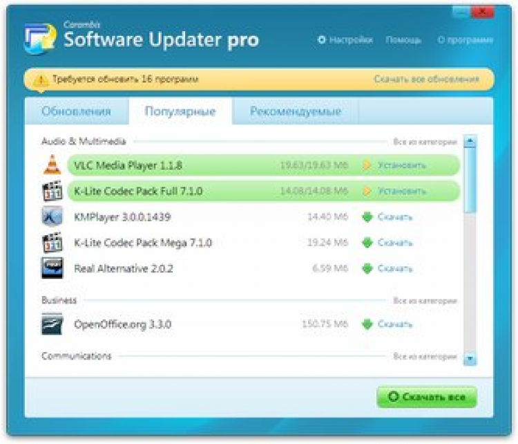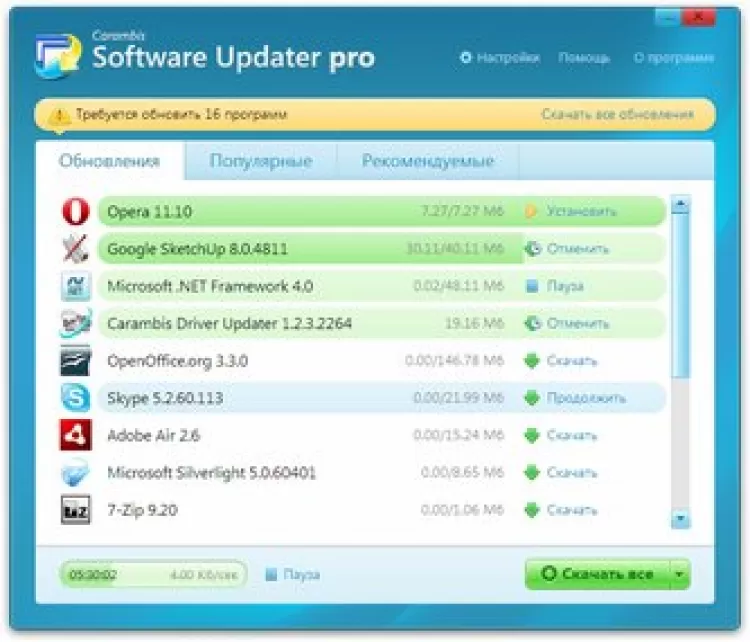 В Carambis Software Updater Pro есть встроенный планировщик задач и менеджер загрузок. Кроме этого, она также предоставляет список популярных и рекомендуемых программ, что будет полезно пользователям, которые купили новый компьютер или переустановили систему.