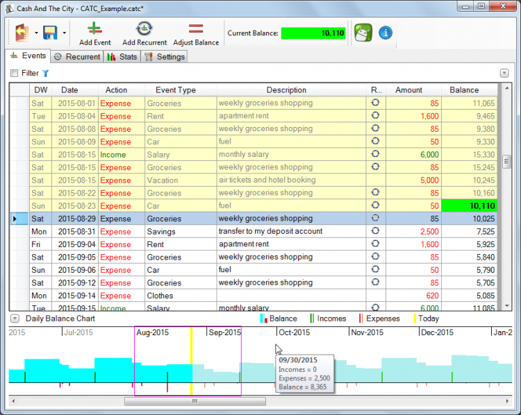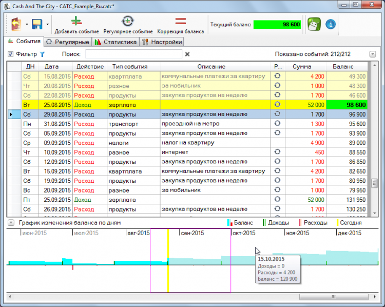 Cash And The City Cash And The City - это простая программа под Windows для планирования и ведения учёта Ваших личных или семейных финансов. Программа предоставляет такие возможности, как планирование повторяющихся расходов и доходов, прогнозирование баланса согласно запланированным событиям, коррекция баланса, просмотр статистики в виде графиков и таблиц, защита паролем, экспорт в Excel и др.