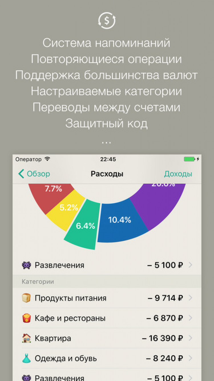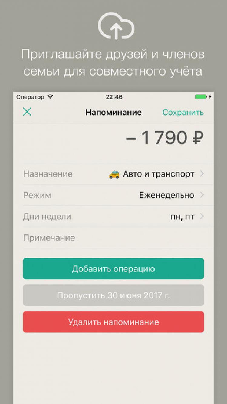 - Встроенная система напоминаний, повторяющиеся операции.