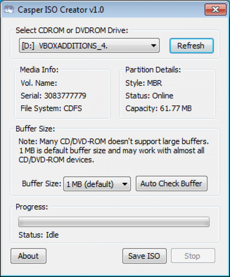 Casper ISO Creator - утилита для создания ISO образов CD и DVD дисков. Casper ISO Creator очень проста в использовании. Вам нужно указать CD/DVD привод с дисков, образ которого нужно создать, выбрать размер буфера и нажать кнопку "Save ISO". Несмотря на свою простоту, утилита быстро создает точные копии CD/DVD дисков.